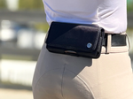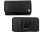 Features belt loots, belt clip, silver rivet logo, elastic sides for adjustable widths and hook and loop closure. Fits on belt up to 2.5 inches. Measures 7” x 3.5”, sized to fit larger phones. Black only.